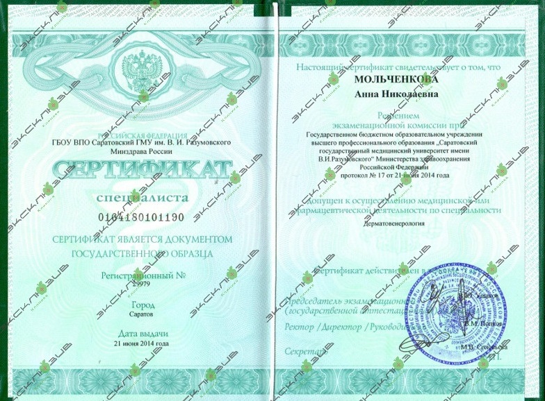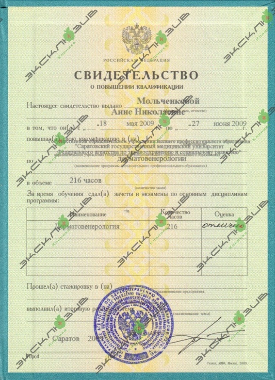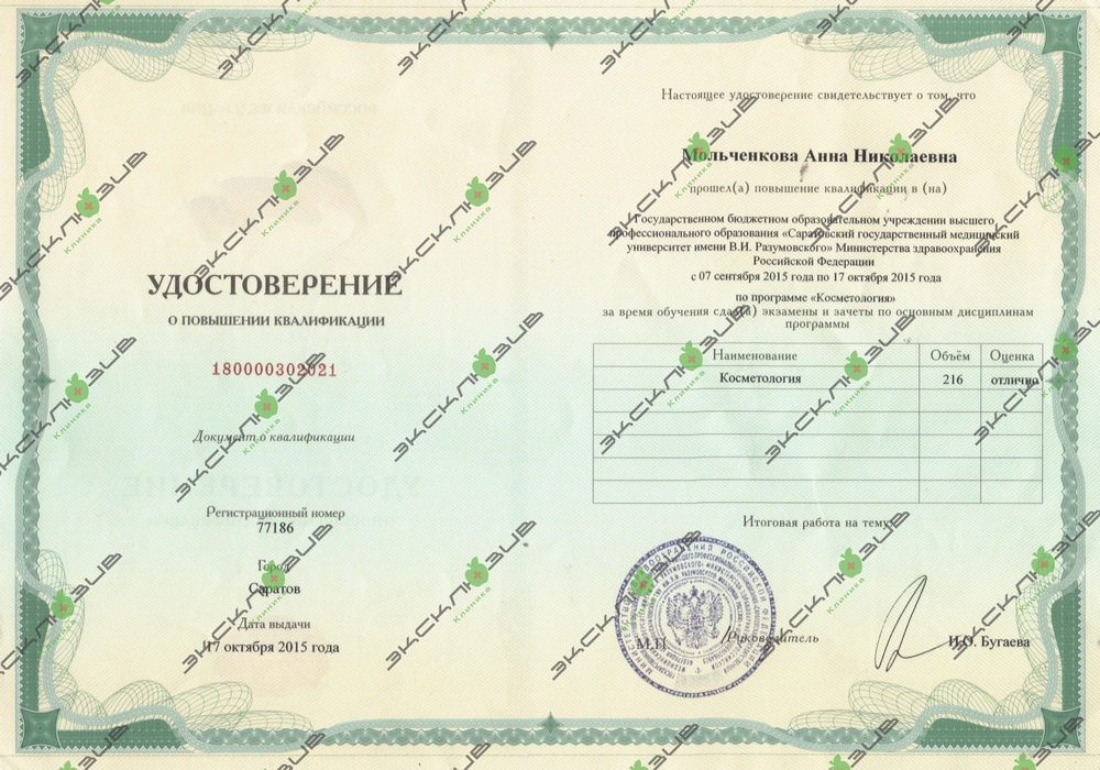 - Диплом о профессиональной переподготовке в Саратовском государственном медицинском университете - специальность «Косметология», 2011г.