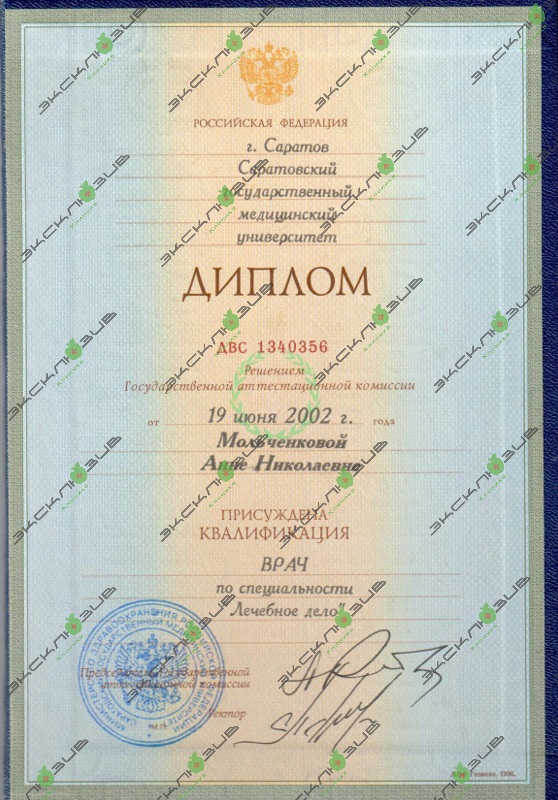 - Диплом Саратовского государственного медицинского университета - врач по специальности «Лечебное дело», 2002 г.