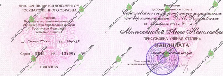- Диплом Саратовского государственного медицинского университета о присуждении ученой степени кандидата медицинских наук, 2011г.