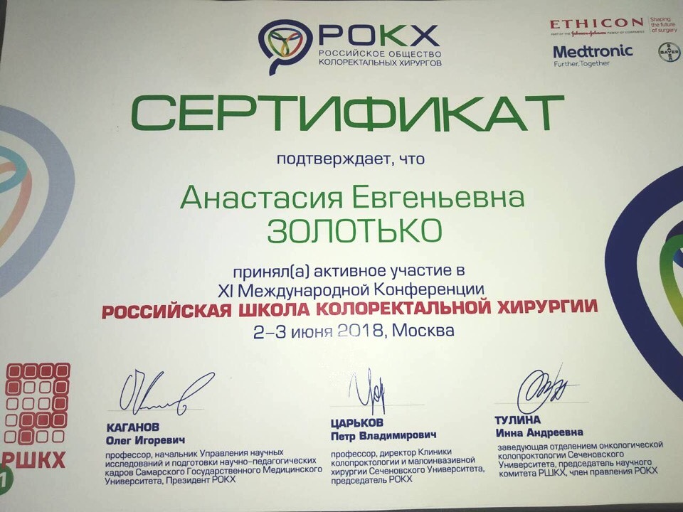 Ведущий колопроктолог клиники «Эксклюзив» Золотько Анастасия Евгеньевна приняла активное участие в работе конференции. Она стала победителем конкурса научных работ в номинации «Лучший устный доклад» на тему: «Анальная плазмотерапия как эффективный метод безоперационного лечения длительно незаживающих ран анального канала». Традиционно конкурс научных работ проводится в три этапа, первый - сбор тезисов от специалистов по всей России, второй — оценка тезисов по новизне, научной и практической значимости экспертным жюри, состоящих из ведущих специалистов в области проктологии России и третий этап — оценка представления докладов во время конференции.
