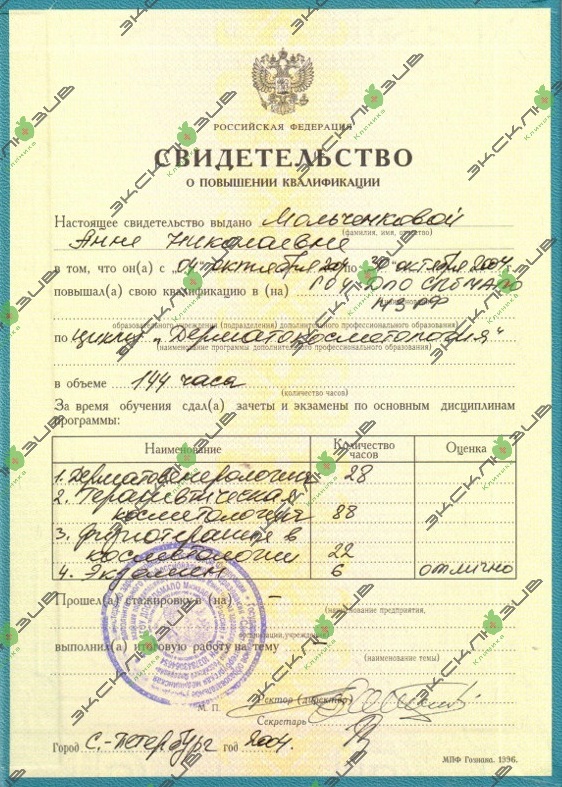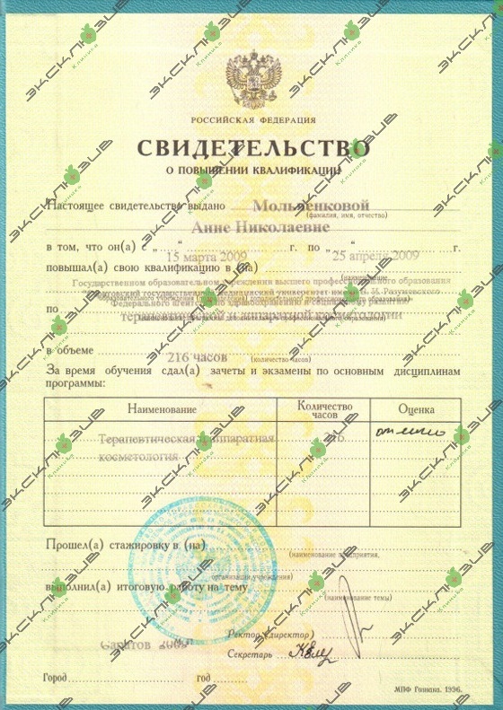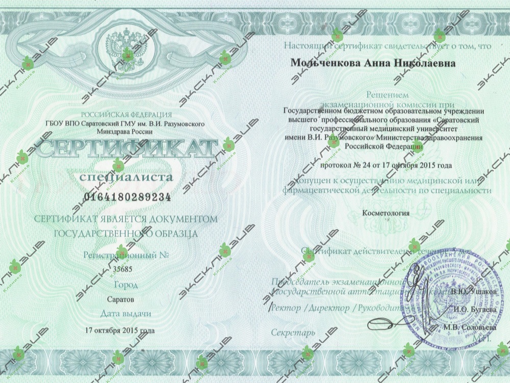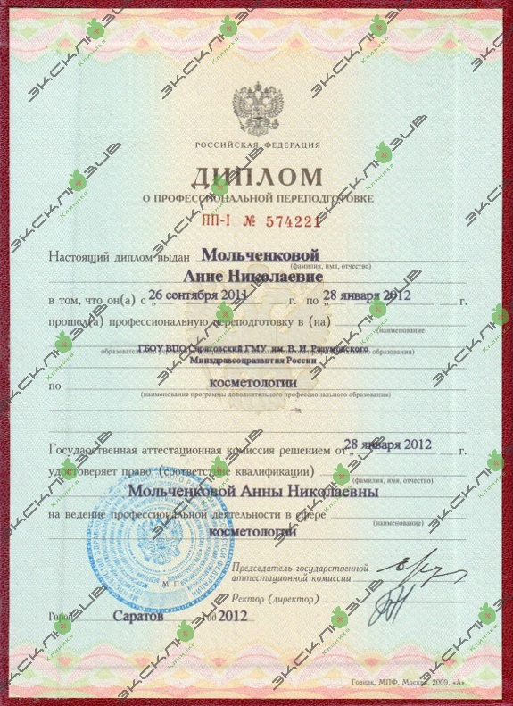 - Диплом о профессиональной переподготовке в Саратовском государственном медицинском университете - специальность «Косметология», 2011г.
