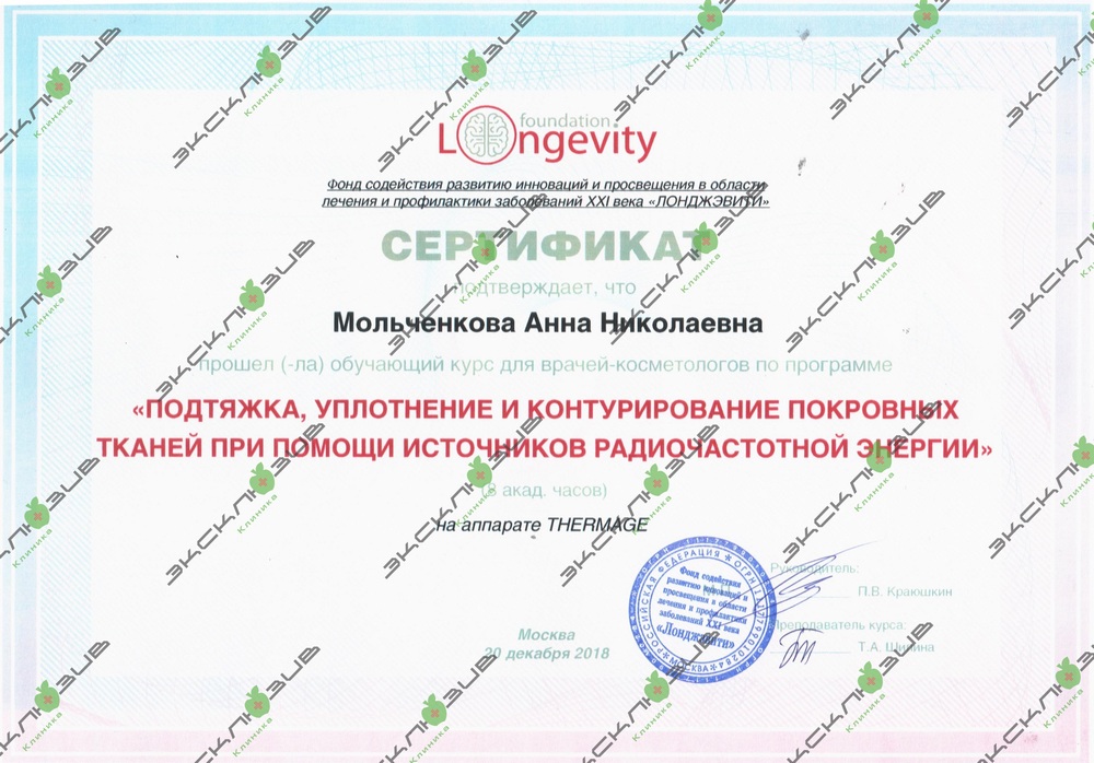 - Сертификат о профессиональной переподготовке "Дерматовенерология" 23.04.2024 г. Действует до 23.04.2029г.